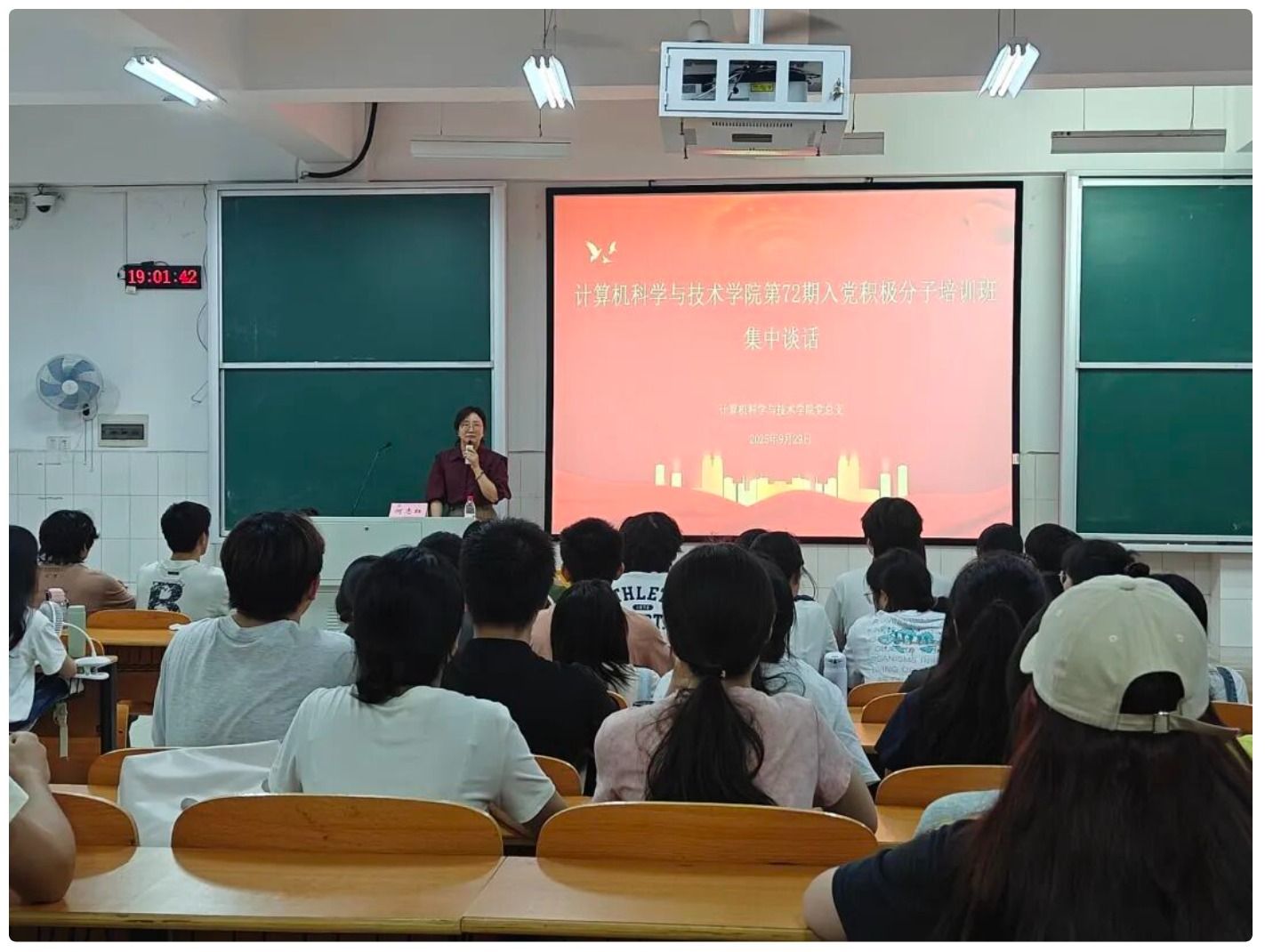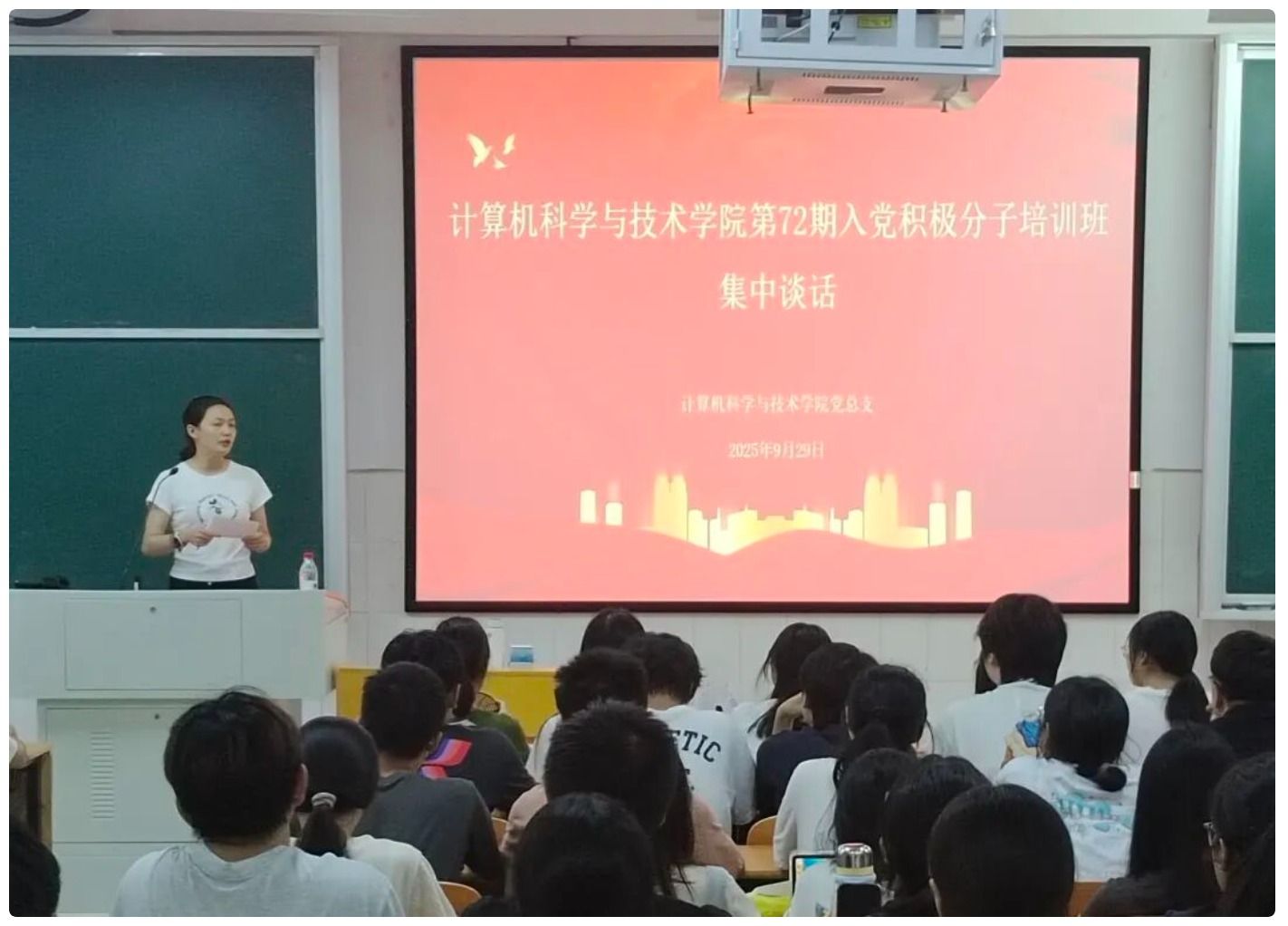接着,何志红书记组织全体学员共同观看廖雅琛同志的视频演讲《生命的抉择》,聆听蒋先云同志的先进事迹。结合典型案例,何书记进一步引导学员思考入党动机:“加入中国共产党,应源于对党的真挚热爱与深刻认同,而非功利性诉求。” 她要求全体学员始终牢记 “全心全意为人民服务” 的根本宗旨,做到 “知信行统一、学思用贯通”—— 既要从革命先辈为民族独立、人民幸福不懈奋斗的事迹中汲取精神力量,在理论学习中筑牢理想信念;又要注重实践转化,打破学科壁垒、推动文理融合,将所学知识与服务同学、奉献集体的行动结合起来,在实践中深化对党的认识。