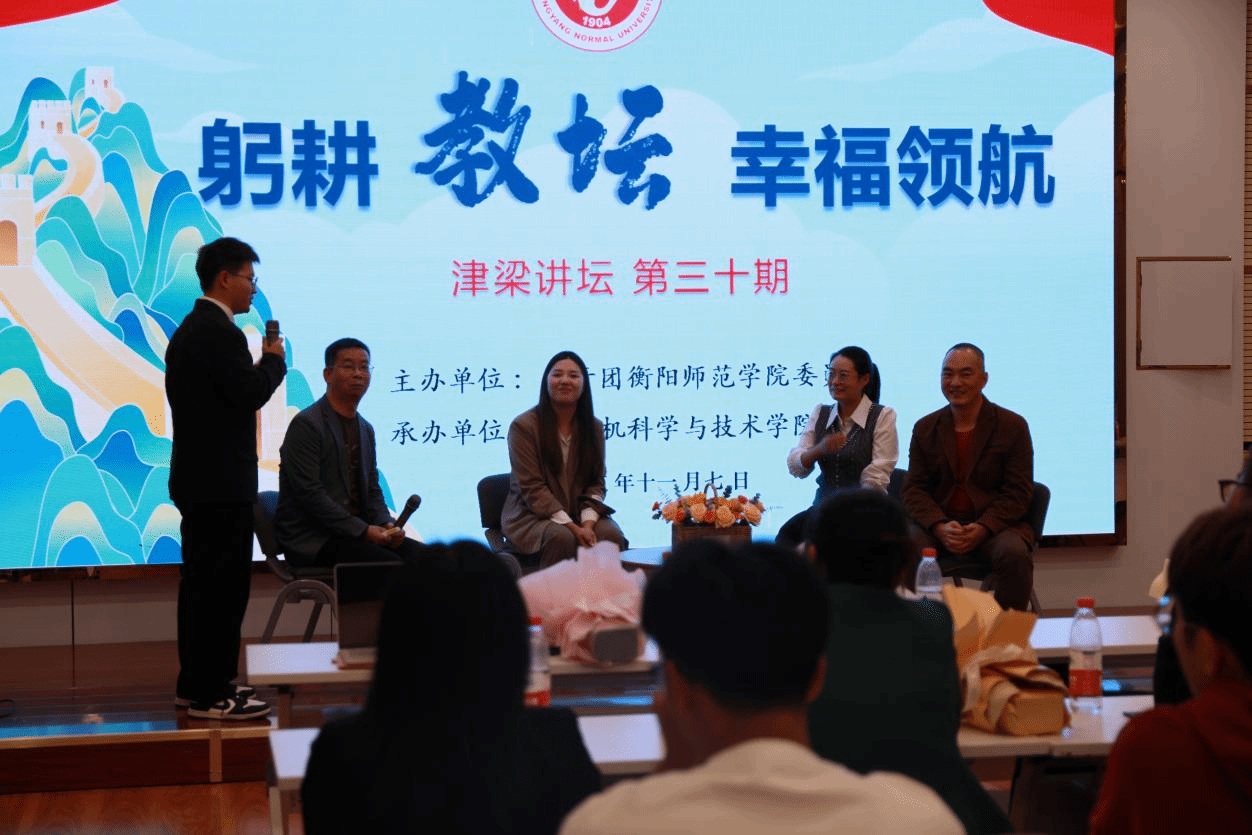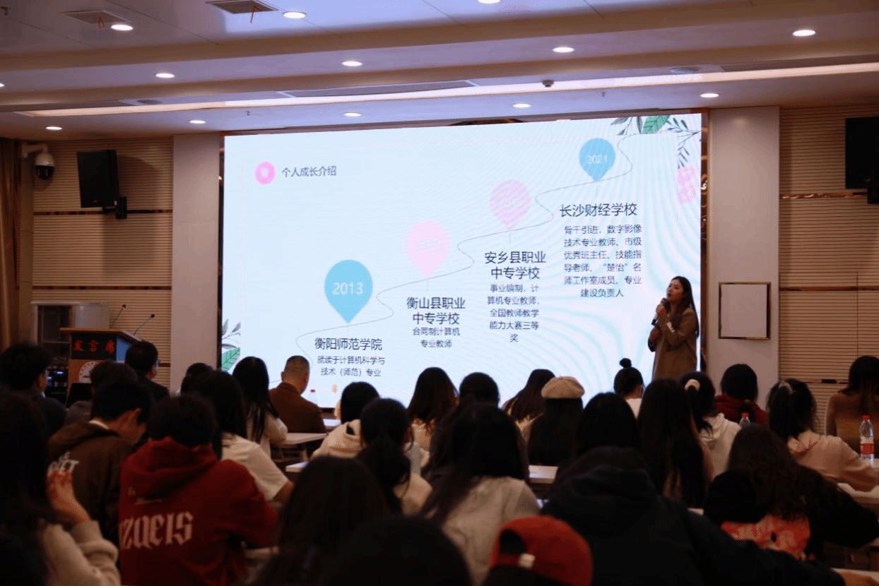 随后,衡阳市船山实验中学办公室主任蒋颖洁、长沙财经学校教师严鑫紧扣“教书育人,知行合一”分享了个人经历、专业发展与精神成长等内容。她们结合中学、中职信息技术教育行业的大背景以及个人多年工作的经历,向现场同学们展示了真实而火热的从教生涯,同时以自身从事信息技术教学专业研究的经历与目标为同学们提供了未来教学和科研职业生涯新的思路。