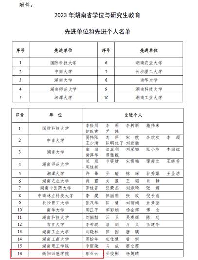 我院彭亚云老师获湖南省学位与研究生教育先进个人表彰