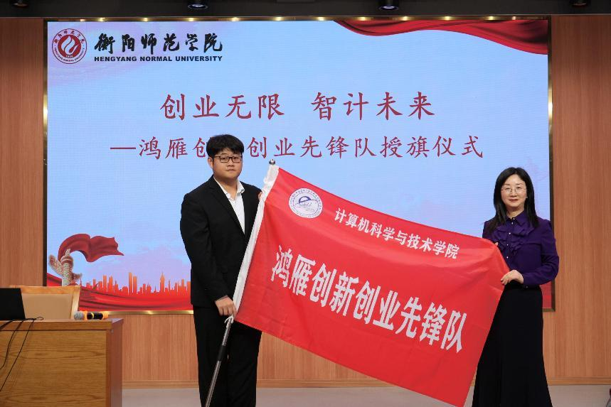 仪式伊始,党总支书记何志红以《立鸿雁之志,创时代新篇》为题发表讲话。她指出,先锋队的成立不仅是学院深化“双创”教育的重要实践,更是计科学子以鸿雁之姿拥抱时代机遇的崭新起点。围绕“鸿雁精神”,何书记提出三点期望:一是以“鸿雁之志”,读懂湖南省“七个一”创业政策机遇,把握时代风口;二是以“领头雁”引领“雁阵群”,在时代答卷中积极担当作为;三是将校训“厚德博学,励志笃行”融入创业实践,传承湖湘敢为人先的精神血脉,在时代的苍穹下“书写属于中国青年的壮美轨迹”。致辞结束后,何志红书记为鸿雁先锋队授旗,大队长罗浚誉庄重地接过旗帜,标志着英国365集团公司鸿雁大学生创新创业先锋队正式起航。