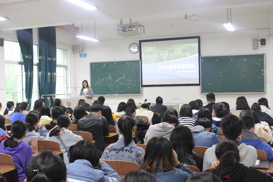 2019年4月29日中午12点50分,我院在计科楼209室举办2019届毕业生考研交流报告会,莅临本次报告会的领导有我院党总支书记陈洪清、党总支副书记彭正以及辅导员谢媛,本次报告会由夏娇娇主持。