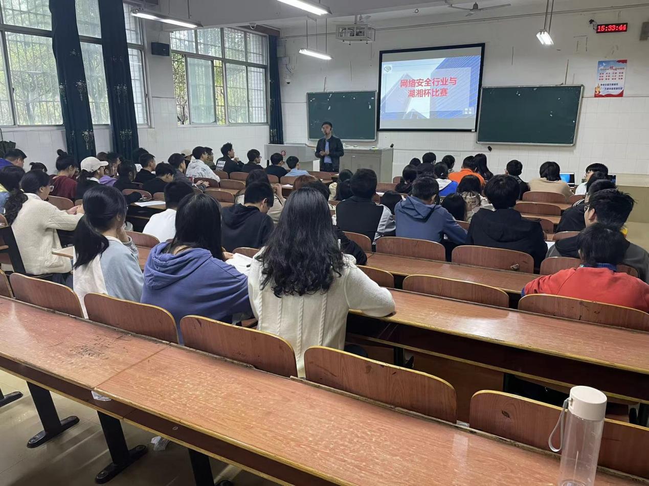 主要开展了以下三个方面的网络安全宣传教育活动:一是网络安全意识大讲堂和网络安全体验活动,邀请湖南省网安基地科技有限公司联合创始人熊勇总经理,重点针对软件工程专业和物联网工程专业的学生做了精彩的报告;二是在前期CTF竞赛中获胜的同学颁发了奖品;三是湖湘杯竞赛辅导,为准备参加第七届“湖湘杯”网络安全技能大赛的同学讲解赛制、组织分组和匹配队伍等。