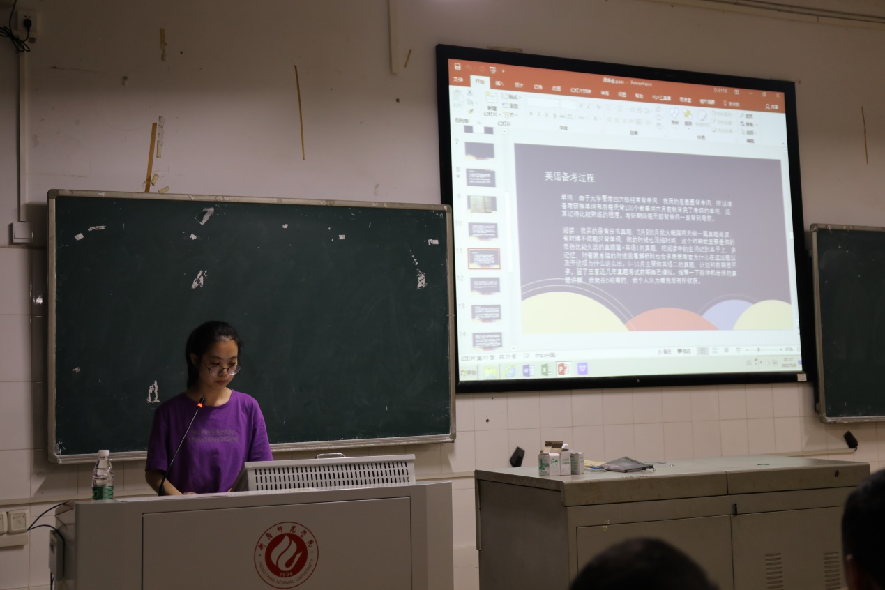 经验分享会伊始,孙薇、彭威等5名2022届考研成绩优异的学生从报考院校选择、各科复习方法、是否报班、考研资料获取、考研信心与决心、备考心态、作息时间安排、初试、复试和考研调剂等方面作了详细介绍,从多个角度给同学们分享了各科学习经验和自我体会总结,鼓励备考的同学们调整好心态,积极备考。