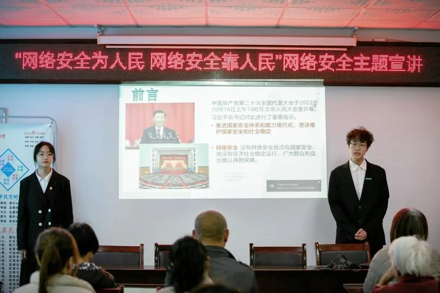 首先,志愿者们为新风里社区居民进行了网络安全知识的普及宣讲,介绍了常见的预防网络诈骗手段。宣讲内容生动详实,拓宽了社区居民的网络安全视野,有效帮助居民提高了个人网络信息的安全防范能力。