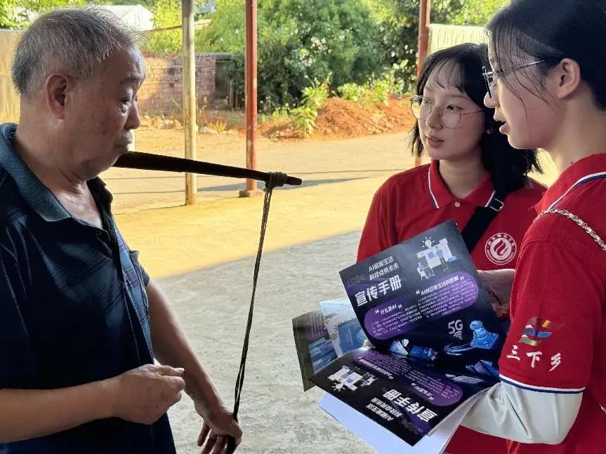 实践团成员曹嘉慧、马子婷为当地居民发放AI宣传手册并进行深入调研