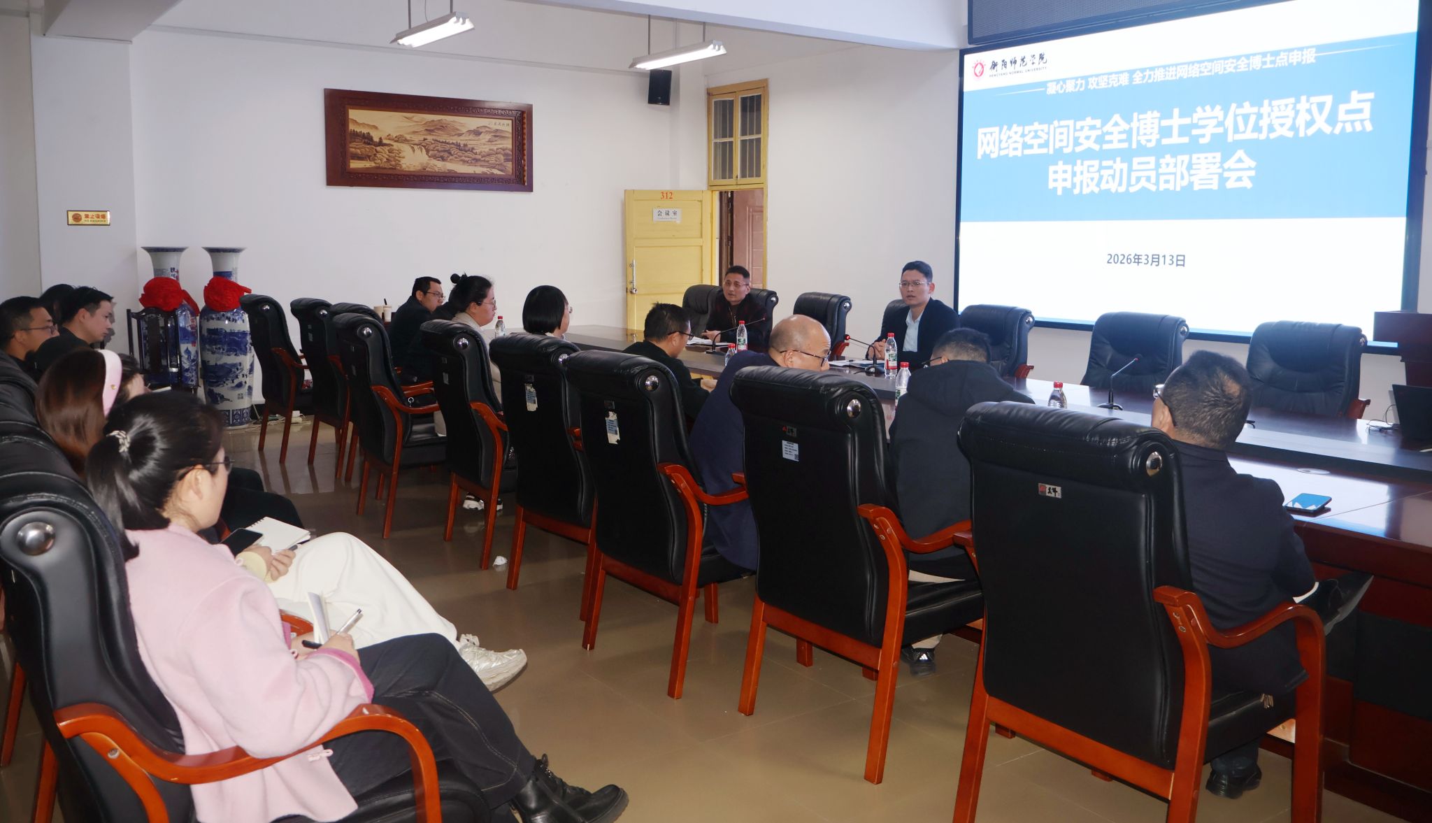 会上,赵辉煌副院长指出目前我校已成功获批为湖南省立项建设的新增博士学位授予单位,新增网络空间安全博士学位授权点对提升学院办学层次、优化学科布局、增强核心竞争力具有重要意义,网络空间安全博士点申报要在前期学位点建设的扎实基础上,持续发力,对标对表,部署下一阶段博士点申报准备工作。