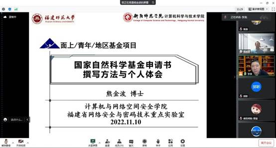 2022年11月10日20:00,我院2023年度国家自然科学基金申报交流会使用腾讯会议线上召开,特邀福建师范大学熊金波教授作学术报告,会议由我院院长李浪教授主持,英国365集团公司部分老师及研究生参加了此次会议。