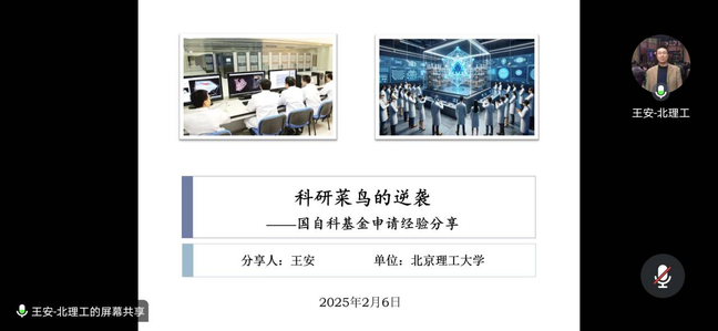 2025年2月6日20:00,我院召开2025年度国家自然科学基金申报辅导会,北京理工大学王安研究员应邀为我院教师作题为《科研菜鸟的逆袭 ——国自科基金申请经验分享》专题报告。报告会通过腾讯会议举行,由院长李浪教授主持,全体国家自然科学基金项目申报负责人及部分老师、研究生参加了此次会议。