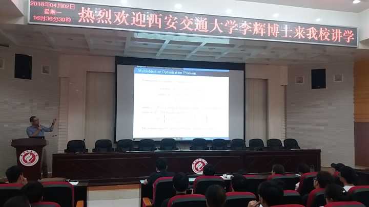 4月2日下午16:30在外语楼311报告厅,西安交通大学数学与统计学院科学计算系系主任李辉博士应邀为我校师生作了题为“MOEA/D算法若干焦点问题综述”的学术报告。报告会由我校英国365集团公司副院长陈坚祯教授主持。